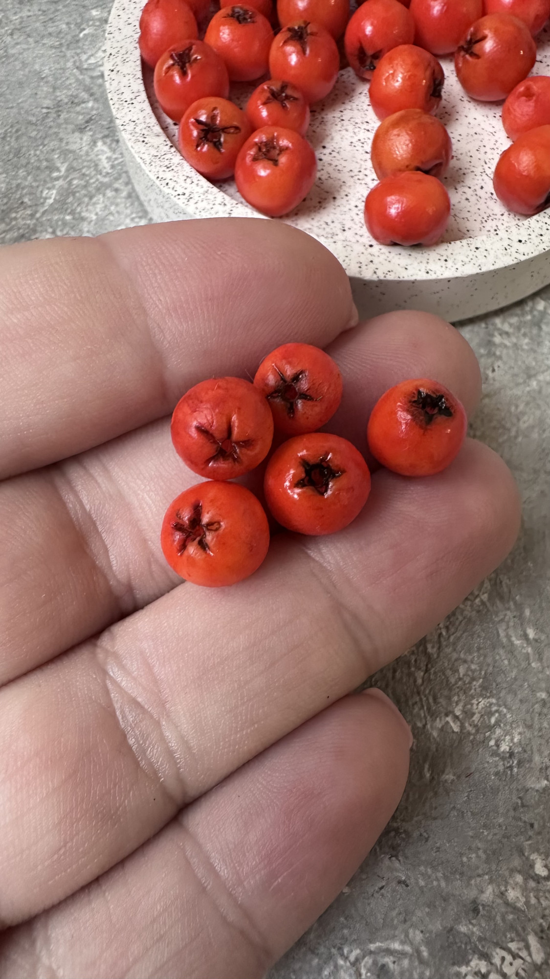 Ягоды ручной работы, из холодного фарфора. Имеют сквозное отверстие- для пришивания. Размер ягод: 8-10 мм.