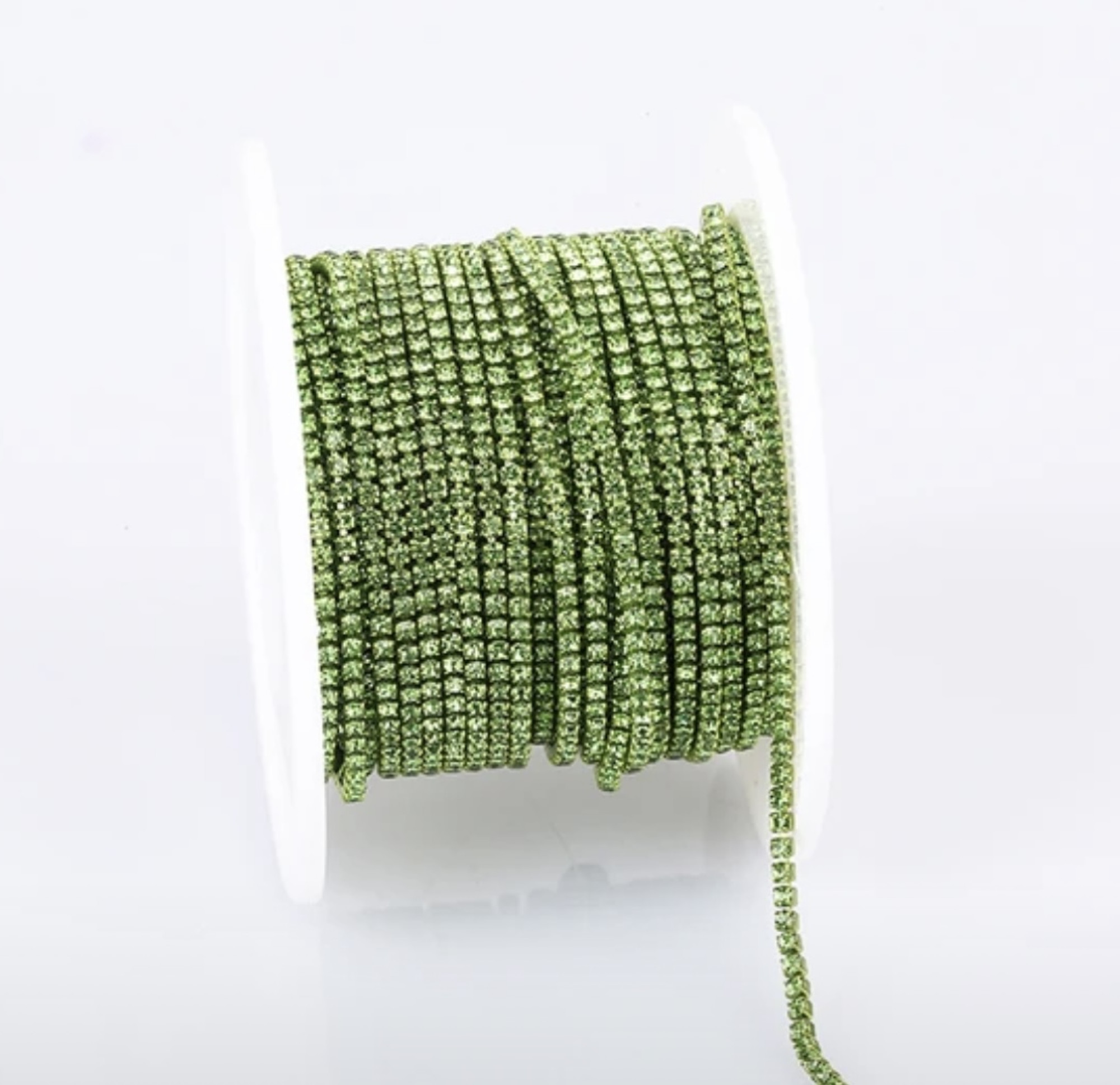 Стразовая цепь, цвет светло-зеленая, оправа светло-зеленая, размер 1,5 мм, цена указана за отрезок длиной 10см